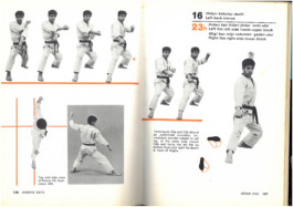 Superbe livre sur le karaté, mêlant photographies en noir et blanc (prises en studio sur fond gris ou détourées) et éléments graphiques orange vif. Les 25 mouvements y sont expliqués avec une grande clarté, grâce à un système de fléchage précis et à des prises de vue multiples : de face, de profil, et en plongée. Le maître Hirokazu Kanazawa, en tenue de karaté, semble littéralement se déplacer sur de longues flèches orange qui traversent certaines doubles pages de part en part — une mise en scène graphique à la fois dynamique et rigoureuse.